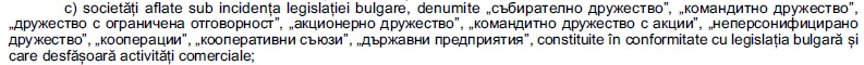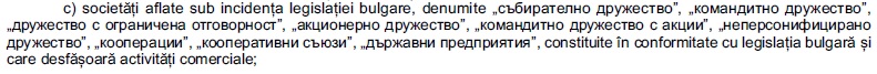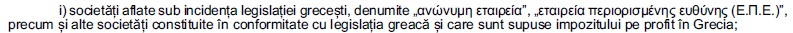o) societăţi aflate sub incidenţa legislaţiei letone, denumite "akciju sabiedriba", "sabiedriba ar ierobezotu atbildibu";p) societăţi aflate sub incidenţa legislaţiei lituaniene;q) societăţi aflate sub incidenţa legislaţiei luxemburgheze, denumite "societe anonyme", "societe en commandite par actions", "societe a responsabilite limitee", "societe cooperative", "societe cooperative organisee comme une societe anonyme", "association d'assurances mutuelles", "association d'epargne-pension", "entreprise de nature commerciale, industrielle ou miniere de l'Etat, des communes, des syndicats de communes, des etablissements publics et des autres personnes morales de droit public", precum şi alte societăţi comerciale constituite în conformitate cu legislaţia luxemburgheză şi supuse impozitului pe profit în Luxemburg;r) societăţi aflate sub incidenţa legislaţiei ungare, denumite "kozkereseti tarsasag", "beteti tarsasag", "kozos vallalat", "korlatolt felelossegu tarsasag", "reszvenytarsasag", "egyesules", "szovetkezet";s) societăţi aflate sub incidenţa legislaţiei malteze, denumite "Kumpaniji ta' Responsabilita' Limitata", "Socjetajiet en commandite li l-kapital taghhom maqsum f'azzjonijiet";ş) societăţi aflate sub incidenţa legislaţiei olandeze, denumite "naamloze vennootschap", "besloten vennootschap met beperkte aansprakelijkheid", "open commanditaire vennootschap", "cooperaţie", "onderlinge waarborgmaatschappij", "fonds voor gemene rekening", "vereniging op cooperatieve grondslag", "vereniging welke op onderlinge grondslag als verzekeraar of kredietinstelling optreedt", precum şi alte societăţi constituite în conformitate cu legislaţia olandeză şi care sunt supuse impozitului pe profit în Ţările de Jos;t) societăţi aflate sub incidenţa legislaţiei austriece, denumite "Aktiengesellschaft", "Gesellschaft mit beschrankter Haftung", "Versicherungsvereine auf Gegenseitigkeit", "Erwerbs- und Wirtschaftsgenossenschaften", "Betriebe gewerblicher Art von Korperschaften des offentlichen Rechts", "Sparkassen", precum şi alte societăţi comerciale constituite în conformitate cu legislaţia austriacă şi care sunt supuse impozitului pe profit în Austria;ţ) societăţi aflate sub incidenţa legislaţiei poloneze, denumite "spolka akcyjna", "spolka z ograniczona odpowiedzialnoscia";u) societăţi comerciale sau societăţi civile care îmbracă o formă comercială şi cooperative şi întreprinderi publice înfiinţate în conformitate cu legislaţia portugheză;v) societăţi aflate sub incidenţa legislaţiei române, cunoscute drept: "societăţi pe acţiuni", "societăţi în comandită pe acţiuni" şi "societăţi cu răspundere limitată";w) societăţi aflate sub incidenţa legislaţiei slovene, denumite "delniska druzba", "komanditna druzba", "druzba z omejeno odgovornostjo";x) societăţi aflate sub incidenţa legislaţiei slovace, denumite "akciova spolocnost", "spolocnost's rucenim obmedzenym", "komanditna spolocnost";y) societăţi aflate sub incidenţa legislaţiei finlandeze, denumite "osakeyhtio"/"aktiebolag", "osuuskunta"/"andelslag", "saastopankki"/"sparbank" şi "vakuutusyhtio"/"forsakringsbolag";z) societăţi aflate sub incidenţa legislaţiei suedeze, denumite "aktiebolag", "forsakringsaktiebolag", "ekonomiska foreningar", "sparbanker", "omsesidiga forsakringsbolag", "forsakringsforeningar";aa) societăţi constituite în conformitate cu legislaţia din Regatul Unit.Anexa nr. 4LISTA IMPOZITELORla care se face referire la art. 33alin. (2) pct. 12 lit. c)Pentru îndeplinirea condiţiei de la art. 33 alin. (2) pct. 12 lit. c), societatea dintr-un stat membru trebuie să plătească, în conformitate cu legislaţia fiscală a statului respectiv, fără posibilitatea unei opţiuni sau exceptări, unul din următoarele impozite:– impot des societes/vennootschapsbelasting în Belgia;– ![]()