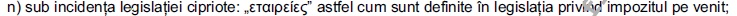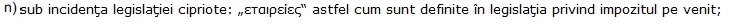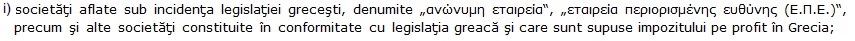 – uznemumu ienakuma nodoklis în Letonia;– pelno mokestis în Lituania;– impot sur le revenu des collectivites în Luxemburg;– tarsasagi ado, osztalekado în Ungaria;– taxxa fuq l-income în Malta;– vennootschapsbelasting în Ţările de Jos;– Korperschaftssteuer în Austria;– podatek dochodowy od osob prawnych în Polonia;– imposto sobre o rendimento das pessoas colectivas în Portugalia;– davek od dobicka pravnih oseb în Slovenia;– dan z prijmov pravnickych osob în Slovacia;– yhteisojen tulovero/inkomstskatten for samfund în Finlanda;– statlig inkomstskatt în Suedia;– corporation tax în Regatul Unit.Anexa nr. 3LISTA SOCIETĂŢILORla care se face referire la art. 33 alin. (2)pct. 12 lit. a)a) societăţi constituite în temeiul Regulamentului (CE) nr. 2.157/2001 al Consiliului din 8 octombrie 2001 privind statutul societăţii europene (SE) şi al Directivei 2001/86/CE a Consiliului din 8 octombrie 2001 de completare a statutului societăţii europene în ceea ce priveşte implicarea lucrătorilor, precum şi societăţi cooperative înfiinţate în temeiul Regulamentului (CE) nr. 1.435/2003 al Consiliului din 22 iulie 2003 privind statutul societăţii cooperative europene (SCE) şi al Directivei 2003/72/CE a Consiliului din 22 iulie 2003 de completare a statutului societăţii cooperative europene în legătură cu participarea lucrătorilor;b) societăţi aflate sub incidenţa legislaţiei belgiene, denumite "societe anonyme"/"naamloze vennootschap", "societe en commandite par actions"/"commanditaire vennootschap op aandelen", "societe privee a responsabilite limitee"/"besloten vennootschap met beperkte aansprakelijkheid", "societe cooperative a responsabilite limitee"/"cooperatieve vennootschap met beperkte aansprakelijkheid", "societe cooperative a responsabilite illimitee"/"cooperatieve vennootschap met onbeperkte aansprakelijkheid", "societe en nom collectif"/"vennootschap onder firma", "societe en commandite simple"/"gewone commanditaire vennootschap", întreprinderile publice care au adoptat una dintre formele juridice menţionate anterior, precum şi alte societăţi comerciale constituite în conformitate cu legislaţia belgiană şi care sunt supuse impozitului pe profit în Belgia;c) ![]()