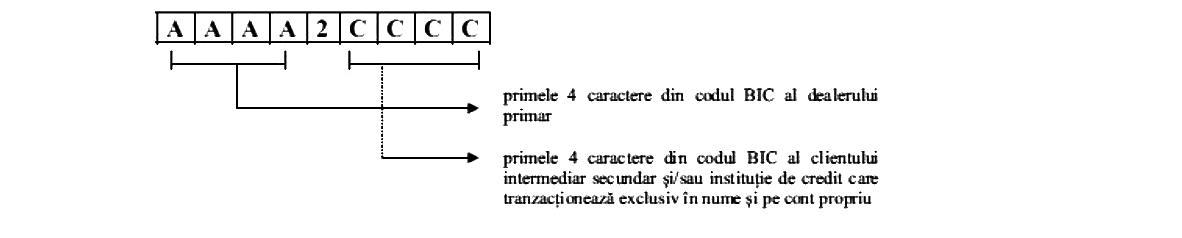 AAAA - reprezintă cod deţinător cont şi este identificat prin primele 4 caractere ale codului BIC;B - reprezintă cod categorie cont:0 pentru deţineri proprii;1 pentru deţineri clienţi cu cont individual şi clienţi cu cont global, alţii decât cei menţionaţi la categoria „2“;2 pentru deţineri în contul intermediarilor secundari şi al instituţiilor de credit cu cont în Sistemul SaFIR care tranzacţionează exclusiv în nume şi pe cont propriu;CCCCCCCCCCCCC - reprezintă cod client şi identifică clientul în Registrul secundar al dealerului primar, format din 13 caractere alfanumerice alocate de dealerul primar. Pentru clienţii intermediari secundari şi instituţii de credit cu cont în Sistemul SaFIR care tranzacţionează exclusiv în nume şi pe cont propriu, primele 4 caractere din codul de client reprezintă în mod obligatoriu primele 4 caractere ale codului BIC al deţinătorului respectiv.Exemple:– cont dealer primar nume propriu:![]()