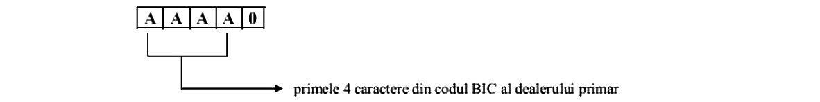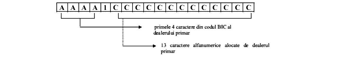 AAAA - reprezintă cod deţinător cont şi este identificat prin primele 4 caractere ale codului BIC;B - reprezintă cod categorie cont:0 pentru deţineri proprii;1 pentru deţineri clienţi cu cont individual şi clienţi cu cont global, alţii decât cei menţionaţi la categoria „2“;2 pentru deţineri în contul intermediarilor secundari şi al instituţiilor de credit cu cont în Sistemul SaFIR care tranzacţionează exclusiv în nume şi pe cont propriu;CCCCCCCCCCCCC - reprezintă cod client şi identifică clientul în Registrul secundar al dealerului primar, format din 13 caractere alfanumerice alocate de dealerul primar. Pentru clienţii intermediari secundari şi instituţii de credit cu cont în Sistemul SaFIR care tranzacţionează exclusiv în nume şi pe cont propriu, primele 4 caractere din codul de client reprezintă în mod obligatoriu primele 4 caractere ale codului BIC al deţinătorului respectiv.Exemple:– cont dealer primar nume propriu:![]()