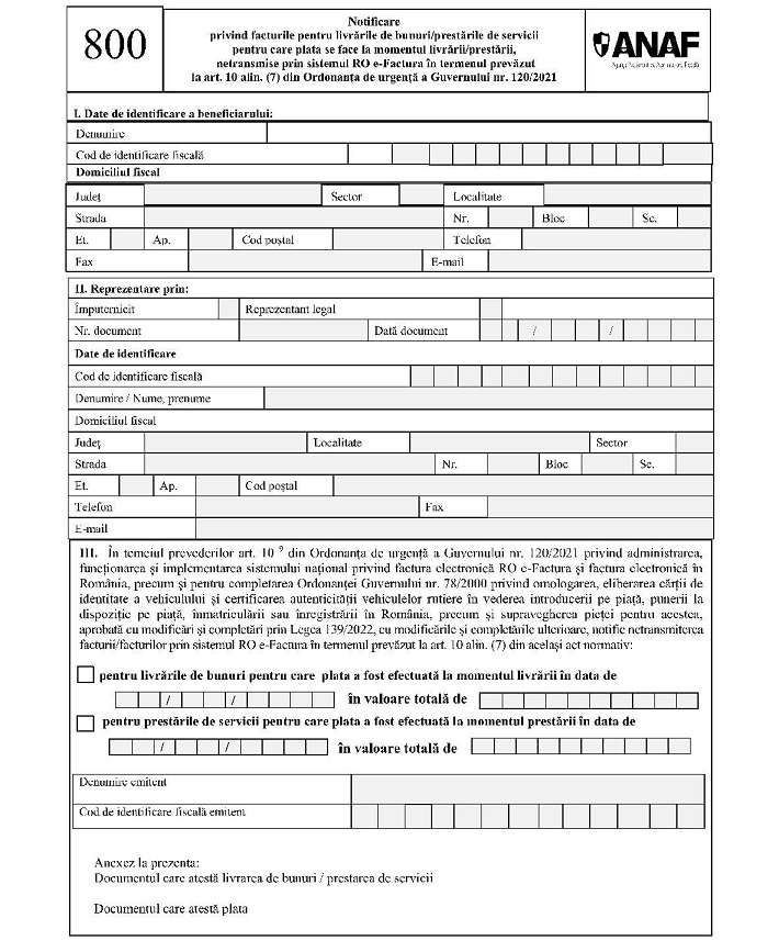de editare, modul de difuzare, utilizare şi păstrare a formularului (800) „Notificare privind facturile pentru livrările de bunuri/prestările de servicii pentru care plata se face la momentul livrării/prestării, netransmise prin sistemul RO e-Factura în termenul prevăzut la art. 10 alin. (7) din Ordonanţa de urgenţă a Guvernului nr. 120/2021“1. Denumirea formularului: (800) „Notificare privind facturile pentru livrările de bunuri/prestările de servicii pentru care plata se face la momentul livrării/prestării, netransmise prin sistemul RO e-Factura în termenul prevăzut la art. 10 alin. (7) din Ordonanţa de urgenţă a Guvernului nr. 120/2021“ 2. Caracteristici de editare: se utilizează echipament informatic pentru completare şi editare.3. Se utilizează de către beneficiarii care nu primesc facturile pentru livrările de bunuri/prestările de servicii pentru care plata a fost efectuată la momentul livrării/prestării, efectuate de persoanele impozabile ce au obligaţia de a transmite facturile către destinatari, în termenul prevăzut la art. 10 alin. (7) din Ordonanţa de urgenţă a Guvernului nr. 120/2021 privind administrarea, funcţionarea şi implementarea sistemului naţional privind factura electronică RO e-Factura şi factura electronică în România, precum şi pentru completarea Ordonanţei Guvernului nr. 78/2000 privind omologarea, eliberarea cărţii de identitate a vehiculului şi certificarea autenticităţii vehiculelor rutiere în vederea introducerii pe piaţă, punerii la dispoziţie pe piaţă, înmatriculării sau înregistrării în România, precum şi supravegherea pieţei pentru acestea, aprobată cu modificări şi completări prin Legea nr. 139/2022, cu modificările şi completările ulterioare, utilizând sistemul naţional RO e-Factura.4. Se completează şi se transmite de beneficiarii care nu primesc facturile prin sistemul RO eFactura, pentru livrările de bunuri/prestările de servicii pentru care plata a fost efectuată la momentul livrării/prestării, sau de împuternicitul/reprezentantul legal al acestuia, după caz.5. Se arhivează în format electronic.