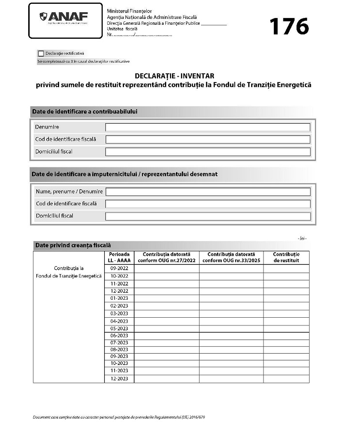 Anexa nr. 3INSTRUCŢIUNIde completare a formularului 176 „Declaraţie-inventar privind sumele de restituit reprezentând contribuţie la Fondul de Tranziţie Energetică“I. Depunerea declaraţieiFormularul 176 „Declaraţie-inventar privind sumele de restituit reprezentând contribuţie la Fondul de Tranziţie Energetică“ se completează şi se depune de contribuabilii care îndeplinesc cumulativ următoarele condiţii:a) au declarat şi plătit contribuţia la Fondul de Tranziţie Energetică;b) au invocat excepţia de neconstituţionalitate care face obiectul Deciziei Curţii Constituţionale nr. 640 din 7 noiembrie 2024 anterior publicării acesteia în Monitorul Oficial al României, Partea I, precum şi de cei care au cauze pe rolul instanţelor judecătoreşti având ca obiect restituirea sumelor de bani aferente contribuţiei plătite în condiţiile art. 15 din Ordonanţa de urgenţă a Guvernului nr. 27/2022 privind măsurile aplicabile clienţilor finali din piaţa de energie electrică şi gaze naturale în perioada 1 aprilie 2022-31 martie 2023, precum şi pentru modificarea şi completarea unor acte normative din domeniul energiei, aprobată cu modificări şi completări prin Legea nr. 206/2022, cu modificările şi completările ulterioare, pentru perioada cuprinsă între 1 septembrie 2022 şi 31 martie 2025.Formularul 176 „Declaraţie-inventar privind sumele de restituit reprezentând contribuţie la Fondul de Tranziţie Energetică“ se depune împreună cu cererea de restituire la organul fiscal competent în administrarea contribuabilului.În cazul în care contribuabilul corectează declaraţia depusă iniţial, declaraţia rectificativă se întocmeşte pe acelaşi model de formular, înscriind „X“ în spaţiul prevăzut în acest scop.În declaraţia rectificativă se înscriu toate informaţiile prevăzute de formular, inclusiv cele care nu diferă faţă de formularul iniţial. II. Completarea declaraţieiSecţiunea „Date de identificare a contribuabilului“În rubrica „Denumire“ se înscrie denumirea contribuabilului.În rubrica „Cod de identificare fiscală“ se completează codul de identificare fiscală atribuit contribuabilului, conform legii, înscriindu-se cifrele cu aliniere la dreapta.Rubricile privind adresa se completează cu datele privind adresa domiciliului fiscal al contribuabilului sau adresa sediului social din ţara de rezidenţă în cazul persoanelor nerezidente. Secţiunea „Date de identificare a împuternicitului/ reprezentantului desemnat“În rubrica „Nume, Prenume/Denumire“ se înscriu, după caz, numele şi prenumele sau denumirea împuternicitului sau reprezentantului desemnat, iar în rubrica „Cod de identificare fiscală“ se completează codul de identificare fiscală al împuternicitului sau reprezentantului desemnat, după caz.Rubricile privind adresa se completează cu datele privind adresa domiciliului fiscal al împuternicitului sau reprezentantului desemnat.Secţiunea „Date privind creanţa fiscală“ATENŢIE!În declaraţie se înscriu numai informaţiile care îndeplinesc, cumulativ, următoarele condiţii:1. pentru perioada fiscală respectivă a fost datorată, declarată și plătită contribuția la Fondul de Tranziție energetică;2. există documente doveditoare pentru îndeplinirea condițiilor prevăzute la art. 1 din Ordonanța de Urgență a Guvernului nr. 33/2025 privind aprobarea restituirii unor sume plătite la Fondul de Tranziție Energetică.În coloana „Contribuţia datorată conform OUG nr. 27/2022“ se înscrie suma reprezentând contribuţia la Fondul de Tranziţie Energetică, declarată la rândul 1 „Suma datorată“ din formularul 100 „Declaraţie privind obligaţiile de plată la bugetul de stat“ depus de contribuabil pentru perioada fiscală respectivă.În coloana „Contribuţia datorată conform OUG nr. 33/2025“ se înscrie suma reprezentând contribuţia la Fondul de Tranziţie Energetică, potrivit art. 2 din Ordonanţa de urgenţă a Guvernului nr. 33/2025, respectiv 80% din contribuţia datorată conform Ordonanţei de urgenţă a Guvernului nr. 27/2022.În coloana „Contribuţie de restituit“ se înscrie suma reprezentând diferenţa între suma înscrisă la coloana „Contribuţia datorată conform OUG nr. 27/2022“ şi suma înscrisă la coloana „Contribuţia datorată conform OUG nr. 33/2025“.Anexa nr. 4CARACTERISTICILE de editare, modul de difuzare, de utilizare şi păstrare a formularului 176 „Declaraţie-inventar privind sumele de restituit reprezentând contribuţie la Fondul de Tranziţie Energetică“1. Denumire: „Declaraţie-inventar privind sumele de restituit reprezentând contribuţie la Fondul de Tranziţie Energetică“ (formular 176)1.1. Caracteristici de editare: se poate utiliza echipament informatic pentru completare şi editare. 1.2. Se utilizează ca anexă la Cererea de restituire.1.3. Se completează şi se depune de contribuabilii care îndeplinesc condiţiile de la art. 1 din Ordonanţa de urgenţă a Guvernului nr. 33/2025.1.4. Circulă la organul fiscal central competent.1.5. Se arhivează la organul fiscal central competent.Anexa nr. 5MINISTERUL FINANŢELOR AGENŢIA NAŢIONALĂ DE ADMINISTRARE FISCALĂUnitatea fiscală^1 ...................^1 Se menţionează denumirea organului fiscal emitent.Serviciul/Biroul/Compartimentul ..............Nr. .............../..............PROCES-VERBAL DE PUNERE DE ACORDîncheiat astăzi, .........../......../........., la sediul unităţii fiscaleSubsemnatul(a), ........................., având funcţia de ......................... în cadrul Serviciului/Biroului/Compartimentului ........................., am procedat la clarificarea neconcordanţelor existente între sumele înscrise în Declaraţia-inventar nr. ................ din data de ......................... şi cele din evidenţa debitorului. Drept urmare, am constatat că .........................^2 figur