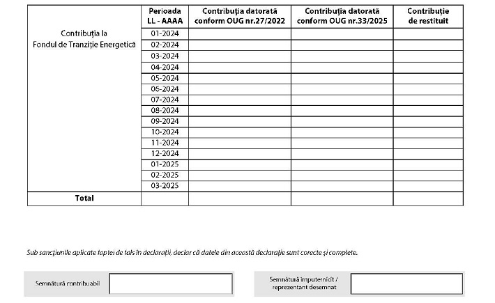 | Contribuţia la Fondul de Tranziţie Energetică | Perioada LL-AAA | Contribuţia datorată şi plătită conform OUG nr. 27/2022 | Contribuţia datorată conform OUG nr. 33/2025 | Contribuţie de restituit |