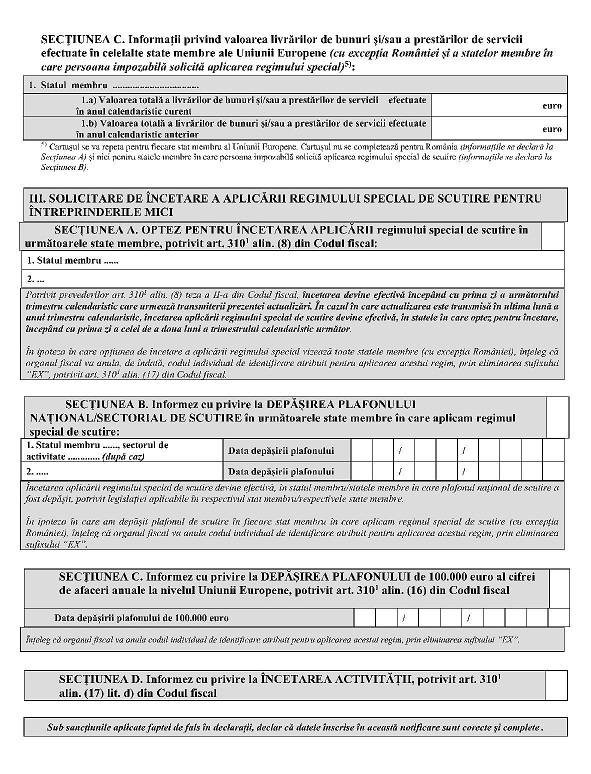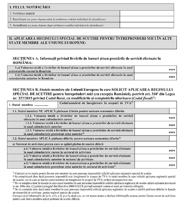 INSTRUCŢIUNIde completare a Notificării prealabile privind regimul specialde scutire la TVA pentru întreprinderile mici în alte statemembre ale Uniunii EuropeneDepunerea notificăriiNotificarea prealabilă privind regimul special de scutire pentru întreprinderile mici se completează şi se depune de către persoanele impozabile stabilite în România, conform art. 266 alin. (2) lit. a) din Legea nr. 227/2015 privind Codul fiscal, cu modificările şi completările ulterioare (Codul fiscal), care optează, în condiţiile prevăzute la art. 310^1 din Codul fiscal, pentru aplicarea regimului special de scutire pentru întreprinderile mici în alte state membre sau care aplică regimul special de scutire în alte state membre.Notificarea prealabilă se completează direct (reprezentant legal) sau prin împuternicit, potrivit prevederilor art. 310^1 din Codul fiscal.Notificarea se completează cu ajutorul sistemului informatic pus la dispoziţie de Centrul Naţional pentru Informaţii Financiare şi se transmite prin mijloace electronice de transmitere la distanţă, potrivit legii.Organul fiscal competent pentru prelucrarea şi gestionarea notificărilor prealabile este Administraţia finanţelor publice pentru contribuabili nerezidenţi din cadrul Direcţiei Generale Regionale a Finanţelor Publice Bucureşti.Completarea notificăriiI. Felul notificăriiSe selectează opţiunea 1, 2 sau 3, după caz.1. Notificarea prealabilă iniţială se completează cu ocazia exercitării iniţiale a opţiunii de a aplica regimul special de scutire în alte state membre ale Uniunii Europene decât România.2.1. Rectificarea se depune, până la atribuirea codului individual de identificare pentru aplicarea regimului, dacă persoana impozabilă identifică erori materiale în informaţiile înscrise în notificarea prealabilă iniţială, pentru corectarea erorilor materiale.2.2. În rectificare se înscriu toate informaţiile corect completate, valabile la momentul completării, chiar dacă au fost înscrise în notificarea prealabilă iniţială.2.3. Erori materiale pot fi considerate cele care se referă la datele de identificare ale persoanei impozabile (denumire, domiciliu fiscal etc.), valorile livrărilor de bunuri şi/sau ale prestărilor de servicii înscrise în notificarea prealabilă iniţială, retragerea intenţiei de aplicare a regimului special de scutire în unul sau în mai multe state membre dintre cele înscrise în notificarea prealabilă iniţială.2.4. Rectificarea înlocuieşte notificarea prealabilă iniţială, iar organul fiscal competent transmite informaţiile din rectificare, pe cale electronică, către statele membre pentru care persoana a optat să aplice regimul special de scutire, în vederea confirmării acordării scutirii de către acele state.3. Actualizarea se depune de persoana impozabilă, după atribuirea codului individual de identificare, pentru declararea următoarelor situaţii:– orice modificări ale informaţiilor furnizate anterior;– intenţia de a se prevala de scutire într-un alt stat membru sau în alte state membre decât cel indicat sau cele indicate în notificarea prealabilă iniţială;– decizia de a înceta aplicarea regimului special de scutire;– depăşirea plafonului de 100.000 euro al cifrei de afaceri anuale la nivelul Uniunii Europene;– depăşirea plafonului naţional/sectorial în unul/mai multe state membre în care persoana impozabilă aplică regimul special de scutire;– încetarea activităţii.II. Aplicarea regimului special de scutire pentru întreprinderi mici în alte state membre ale Uniunii EuropeneSecţiunea A - Informaţii privind livrările de bunuri şi/sau prestările de servicii efectuate în RomâniaRândul 1.a) Valoarea totală a livrărilor de bunuri şi/sau a prestărilor de servicii efectuate în anul calendaristic curent în RomâniaSe completează, potrivit art. 310^1 alin. (3) lit. d) din Codul fiscal, valoarea totală a livrărilor de bunuri şi/sau a prestărilor de servicii efectuate în anul calendaristic curent în România, de la data de 1 ianuarie a anului calendaristic în care se transmite notificarea prealabilă (sau de la data înfiinţării persoanei impozabile, ulterior datei de 1 ianuarie) până în ziua anterioară celei în care se transmite notificarea prealabilă inclusiv.Rândul 1.b) Valoarea totală a livrărilor de bunuri şi/sau a prestărilor de servicii efectuate în anul calendaristic anterior în RomâniaSe completează, potrivit art. 310^1 alin. (3) lit. c) din Codul fiscal, valoarea totală a livrărilor de bunuri şi/sau a prestărilor de servicii efectuate în anul calendaristic precedent în România, de la data de 1 ianuarie a anului calendaristic precedent celui în care se transmite notificarea prealabilă (sau de la data înfiinţării persoanei impozabile, ulterior datei de 1 ianuarie) până la data de 31 decembrie a anului precedent celui în care se transmite notificarea prealabilă inclusiv.Operaţiunile care fac obiectul raportării pentru rândul 1.a) şi rândul 1.b) sunt cele prevăzute la art. 310 alin. (2) din Codul fiscal.Potrivit art. 310^1 alin. (15) din Codul fiscal, sumele se declară în euro. Pentru livrările de bunuri şi prestările de servicii care au fost efectuate în alte monede, persoana impozabilă utilizează pentru conversie cursul de schimb în vigoare în prima zi a anului calendaristic. Conversia se efectuează prin aplicarea cursului de schimb publicat de Banca Centrală Europeană pentru ziua respectivă sau, în cazul în care acesta nu este publicat în acea zi, în următoarea zi de publicare.Secţiunea B - Statele membre ale Uniunii Europene în care solicit aplicarea regimului special de scutire pentru întreprinderi mici (cu excepţia României), potrivit art. 310^1 din Legea nr. 227/2015 privind Codul fiscal, cu modificările şi completările ulterioare (Codul fiscal)Se completează pentru fiecare stat membru al Uniunii