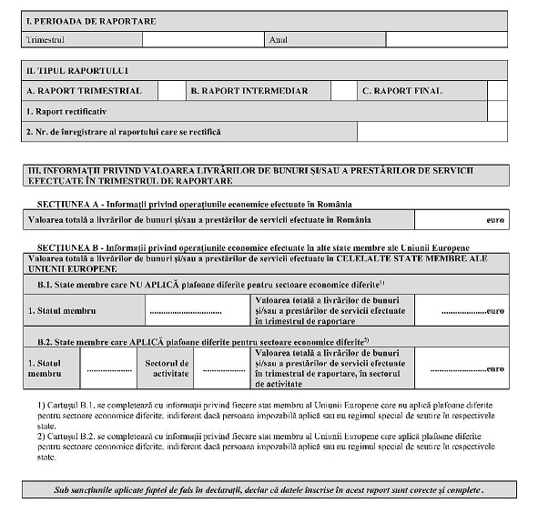 INSTRUCŢIUNIde completare a Raportului privind valoarea totală alivrărilor de bunuri şi/sau a prestărilor de servicii efectuatede persoanele impozabile care aplică, în alte statemembre, regimul special de scutireRaportul privind valoarea totală a livrărilor de bunuri şi/sau a prestărilor de servicii efectuate de persoanele impozabile care aplică, în alte state membre, regimul special de scutire se completează şi se depune trimestrial de către persoanele impozabile stabilite în România, conform art. 266 alin. (2) lit. a) din Legea nr. 227/2015 privind Codul fiscal, cu modificările şi completările ulterioare (Codul fiscal), care aplică, în condiţiile prevăzute la art. 310^1 din Codul fiscal, regimul special de scutire pentru întreprinderile mici în alte state membre decât România.Raportul se completează şi se depune, în conformitate cu prevederile art. 310^1 alin. (13) din Codul fiscal, cu informaţii privind valoarea operaţiunilor efectuate în trimestrul calendaristic anterior.Raportul trimestrial se întocmeşte şi se transmite pentru fiecare trimestru calendaristic, până în ultima zi calendaristică a lunii următoare trimestrului, chiar dacă aceasta este o zi nelucrătoare, potrivit art. 310^1 alin. (13) din Codul fiscal. Raportul final se întocmeşte şi se transmite în termen de 15 zile lucrătoare de la data la care a fost depăşit plafonul cifrei de afaceri anuale la nivelul Uniunii Europene, potrivit art. 310^1 alin. (16) din Codul fiscal.În raport se înscriu valoarea totală a livrărilor de bunuri şi/sau a prestărilor de servicii efectuate în cursul trimestrului calendaristic în România, precum şi valoarea totală a livrărilor de bunuri şi/sau a prestărilor de servicii efectuate în cursul trimestrului calendaristic în fiecare dintre statele membre, altele decât România.În raport se înscriu informaţii privind operaţiunile efectuate în toate statele membre, inclusiv în acele state în care persoana impozabilă nu aplică regimul special de scutire. În cazul în care statul membru aplică plafoane diferite pentru sectoare economice diferite, informaţiile trebuie raportate separat pentru fiecare plafon aplicabil.Pentru statele membre în care persoana impozabilă nu a efectuat livrări de bunuri şi/sau prestări de servicii se înscrie cifra „0“.Sumele se declară în euro, potrivit art. 310^1 alin. (15) din Codul fiscal.Pentru identificarea operaţiunilor efectuate în România care trebuie raportate trimestrial, persoana impozabilă aplică prevederile art. 310 alin. (2) din Codul fiscal. Pentru identificarea operaţiunilor efectuate în alte state membre care trebuie raportate trimestrial sunt aplicabile prevederile art. 310^1 alin. (5) lit. a) - e) din Codul fiscal.Raportul se întocmeşte şi se transmite şi pentru perioada cuprinsă între data depunerii notificării prealabile şi ultima zi a trimestrului în care a fost depusă notificarea prealabilă, în situaţia în care codul individual de identificare pentru aplicarea regimului special de scutire s-a atribuit persoanei impozabile în alt trimestru calendaristic decât trimestrul în care a fost depusă notificarea prealabilă. În această situaţie se selectează opţiunea „Raport intermediar“ şi se înscrie valoarea totală a livrărilor de bunuri şi/sau a prestărilor de servicii efectuate în perioada cuprinsă între data depunerii notificării prealabile şi ultima zi a trimestrului în care a fost depusă notificarea prealabilă.Exemplu: o întreprindere mică depune notificarea prealabilă pe data de 4.03.2026 (în cursul primului trimestru din anul 2026). Persoanei impozabile i se atribuie codul individual de identificare la data de 11.04.2026 (în cursul trimestrului 2 din anul 2026).Informaţiile privind valoarea totală a livrărilor de bunuri şi/sau a prestărilor de servicii efectuate în perioada 1.01-3.03.2026 au fost înscrise în notificarea prealabilă, depusă la data de 4.03.2026.Informaţiile privind valoarea totală a livrărilor de bunuri şi/sau a prestărilor de servicii efectuate în perioada 4.03-31.03.2026 se înscriu într-un raport distinct de raportul aferent trimestrului al 2-lea 2026.În raport se înscriu, dacă este cazul, şi informaţii privind operaţiunile efectuate în statele membre în care persoana impozabilă aplică regimul special OSS-UE, respectiv valoarea fără taxa pe valoarea adăugată a livrărilor de bunuri şi/sau a prestărilor de servicii efectuate în aceste state membre în trimestrul de raportare.Raportul se completează cu ajutorul sistemului informatic pus la dispoziţie de Centrul Naţional pentru Informaţii Financiare şi se transmite prin mijloace electronice de transmitere la distanţă, potrivit legii.Organul fiscal competent pentru prelucrarea şi gestionarea rapoartelor privind valoarea totală a livrărilor de bunuri şi/sau a prestărilor de servicii efectuate de persoanele impozabile care aplică, în alte state membre, regimul special de scutire este Administraţia finanţelor publice pentru contribuabili nerezidenţi din cadrul Direcţiei Generale Regionale a Finanţelor Publice Bucureşti.Completarea raportului privind valoarea totală a livrărilor de bunuri şi/sau a prestărilor de servicii efectuate de persoanele impozabile care aplică, în alte state membre, regimul special de scutireI. Perioada de raportareSe va completa în mod corespunzător cu trimestrul şi anul în care au fost efectuate livrările de bunuri şi/sau prestările de servicii pentru care persoana impozabilă are obligaţia raportării, potrivit art. 310^1 alin. (13) din Codul fiscal.II. Tipul raportuluiA. Raport trimestrial - se selectează această opţiune dacă raportul se depune pentru trimestrul calendaristic anterior.B. Raport intermediar - se selectează această opţiune în situaţia în care codul individual de identificare pentru aplicarea regimului special de scutire s-a atribuit