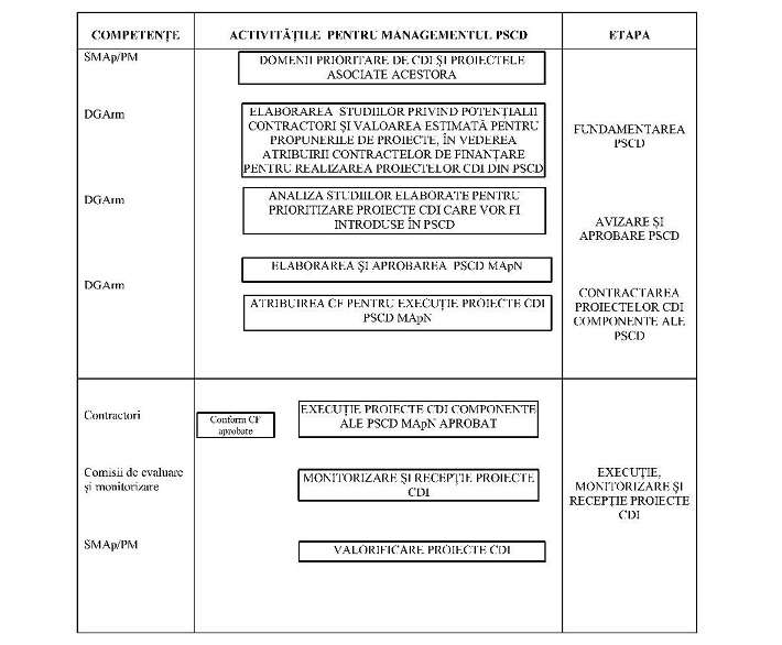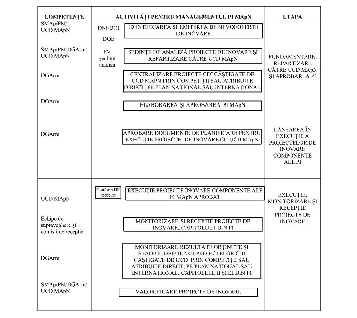 Pentru aplicarea prevederilor art. 10 alin. (2) din Ordonanţa de urgenţă a Guvernului nr. 178/2022 privind sprijinirea entităţilor juridice stabilite în România, în vederea participării la proiecte de colaborare susţinute financiar prin intermediul Fondului European de Apărare (EDF), aprobată prin Legea nr. 5/2024, şi ale dispoziţiilor art. 5 alin. (1) pct. 29 şi 30 din Legea nr. 346/2006 privind organizarea şi funcţionarea Ministerului Apărării Naţionale, republicată, cu modificările şi completările ulterioare,având în vedere dispoziţiile Ordonanţei Guvernului nr. 57/2002 privind cercetarea ştiinţifică şi dezvoltarea tehnologică, aprobată cu modificări şi completări prin Legea nr. 324/2003, cu modificările şi completările ulterioare,în temeiul prevederilor art. 40 alin. (1) din Legea nr. 346/2006, republicată, cu modificările şi completările ulterioare,viceprim-ministrul, ministrul apărării naţionale, emite prezentul ordin.Capitolul I Managementul cercetării-dezvoltării şi inovării în Ministerul Apărării NaţionaleSecţiunea 1 Dispoziţii generaleArticolul 1Managementul cercetării-dezvoltării şi inovării în Ministerul Apărării Naţionale, denumit în continuare MApN, are ca scop:a) definirea obiectivelor activităţilor din domeniul cercetării-dezvoltării şi inovării, denumite în continuare CDI;b) stabilirea responsabilităţilor structurilor implicate în activităţile de CDI în MApN;c) planificarea, atribuirea, finanţarea, monitorizarea şi evaluarea activităţilor de CDI în MApN;d) stabilirea cadrului procedural privind managementul Planului sectorial de cercetare-dezvoltare al MApN, denumit în continuare PSCD MApN;e) stabilirea cadrului procedural privind managementul Planului de inovare al MApN, denumit în continuare PI MApN;f) stabilirea cadrului privind colaborarea în domeniul CDI;g) evidenţa şi valorificarea rezultatelor obţinute în cadrul proiectelor de CDI.Articolul 2Sensul unor termeni şi expresii, precum şi abrevierile utilizate în prezentul ordin sunt prevăzute în anexa nr. 1.Secţiunea a 2-a Obiectivele activităţilor din domeniul CDIArticolul 3Obiectivele activităţilor din domeniul CDI sunt:a) dezvoltarea capabilităţilor operaţionale pentru programele majore din MApN, denumite în continuare PM, în concordanţă cu planurile de înzestrare şi sarcinile asumate la nivelul NATO şi/sau UE;b) menţinerea şi dezvoltarea competenţei ştiinţifice şi tehnice în domeniul apărării şi securităţii;c) asigurarea suportului ştiinţific şi tehnic pentru testarea, evaluarea şi omologarea tehnicii militare în vederea intrării în înzestrarea MApN;d) asigurarea suportului ştiinţific necesar menţinerii sănătăţii, protecţiei şi îmbunătăţirii performanţelor personalului din cadrul MApN;e) asigurarea suportului ştiinţific şi tehnic pentru creşterea interoperabilităţii, a rezilienţei şi a întăririi securităţii aprovizionării;f) corelarea cu iniţiativele NATO şi/sau UE de finanţare a proiectelor de CDI şi de realizare a capabilităţilor pentru apărare.Secţiunea a 3-a Responsabilităţi în domeniul managementului CDI în MApNArticolul 4(1) În cadrul MApN, managementul CDI este asigurat de Direcţia generală pentru armamente, Statul Major al Apărării, de directorii programelor majore şi de unităţile de cercetare-dezvoltare.(2) Direcţia generală pentru armamente, denumită în continuare DGArm, are următoarele atribuţii:a) elaborează strategia MApN în domeniul CDI şi o supune aprobării ministrului apărării naţionale;b) elaborează PSCD MApN, îl supune avizării autorităţii de stat pentru domeniul CDI şi aprobării ministrului apărării naţionale;c) elaborează şi aprobă PI MApN;d) aprobă participarea unităţilor de cercetare-dezvoltare din MApN, denumite în continuare UCD MApN, la competiţiile naţionale şi internaţionale de proiecte, cu avizul structurilor beneficiare ale rezultatelor cercetării;e) semnează acordurile, protocoalele de colaborare şi acordurile de confidenţialitate aferente proiectelor în domeniul CDI, la solicitarea UCD MApN;f) asigură valorificarea rezultatelor obţinute în cadrul proiectelor de inovare, prin:(i) aprobarea transferului/punerii la dispoziţie de către UCD MApN a rezultatelor activităţilor de inovare către structuri din MApN, în baza avizului directorilor PM beneficiare;(ii) avizarea punerii la dispoziţie de către UCD MApN a rezultatelor activităţilor de inovare către persoane juridice, pe termen limitat, în scopul realizării unor proiecte în beneficiul instituţiei militare, în condiţiile legii;g) coordonează, monitorizează şi verifică organizarea şi desfăşurarea activităţilor de CDI în UCD MApN;h) fundamentează finanţarea PI şi PSCD din bugetul MApN, pe baza documentelor cu oferta de execuţie, denumite în continuare DOE, elaborate de către UCD MApN conform modelului prevăzut în anexa nr. 2, şi a studiilor privind potenţialii contractori şi valoarea estimată în vederea atribuirii contractelor de finanţare, denumite în continuare CF, pentru realizarea proiectelor de CDI;i) elaborează studiile privind potenţialii contractori şi valoarea estimată în vederea atribuirii CF pentru realizarea proiectelor de CDI din PSCD MApN;j) organizează şedinţele de analiză în vederea atribuirii proiectelor de inovare către UCD MApN;k) identifică posibilitatea finanţării nevoilor de CDI ale directorilor PM din MApN, din alte surse decât bugetul MApN;l) reprezintă MApN în cadrul relaţiilor de colaborare din domeniul CDI cu autoritatea de stat pentru domeniul CDI, cu unităţile şi entităţile din sistemul naţional de CDI, cu instituţiile componente ale sistemului educaţional de apărare, ordine publică şi securitate naţională, cu instituţiile de învăţământ superior şi cu operatorii economici;m) participă sau organizează manifestări