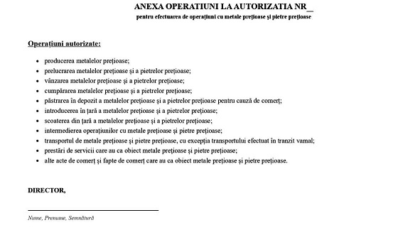 Având în vedere prevederile:– art. 2 pct. 1 lit. b) din Ordonanţa de urgenţă a Guvernului nr. 190/2000 privind regimul metalelor preţioase şi pietrelor preţioase în România, republicată, cu modificările şi completările ulterioare;– art. 5 alin. (5) din Hotărârea Guvernului nr. 700/2012 privind organizarea şi funcţionarea Autorităţii Naţionale pentru Protecţia Consumatorilor, cu modificările şi completările ulterioare;– Referatul nr. 99.637 din 21.11.2025, întocmit de Direcţia tehnică laborator LAREX, metale preţioase, pietre preţioase şi Proces Kimberley,preşedintele Autorităţii Naţionale pentru Protecţia Consumatorilor emite următorul ordin:Articolul IAnexele nr. 2 şi 3 la Ordinul preşedintelui Autorităţii Naţionale pentru Protecţia Consumatorilor nr. 103/2010 privind aprobarea modelului şi conţinutului formularelor tipizate cu regim special ale procesului-verbal de constatare a contravenţiei şi ale anexei acestuia, destinate utilizării în activitatea de control, şi a modelului şi conţinutului formularului tipizat cu regim special al autorizaţiei emise de Autoritatea Naţională pentru Protecţia Consumatorilor persoanelor fizice şi juridice ce efectuează operaţiuni cu metale preţioase şi pietre preţioase, publicat în Monitorul Oficial al României, Partea I, nr. 274 din 27 aprilie 2010, cu modificările ulterioare, se modifică şi se înlocuiesc cu anexele nr. 1 şi 2, care fac parte integrantă din prezentul ordin.Articolul IIPrezentul ordin se publică în Monitorul Oficial al României, Partea I.