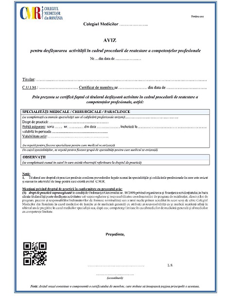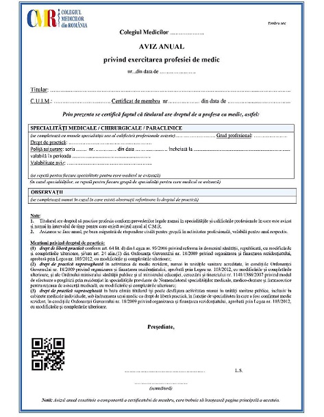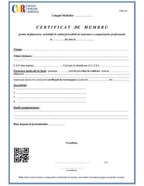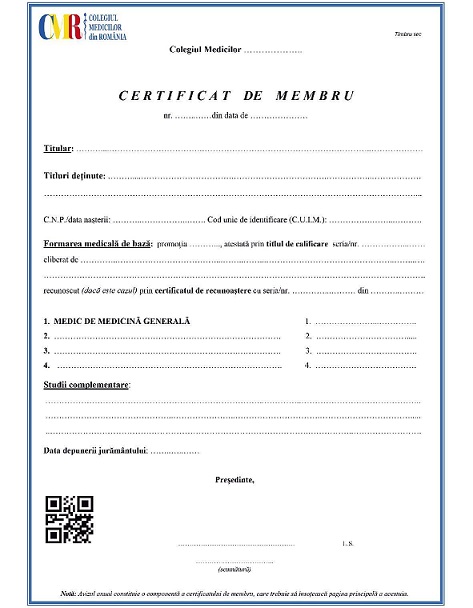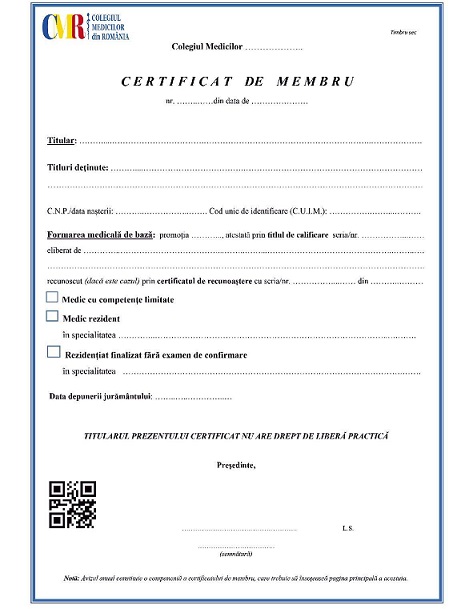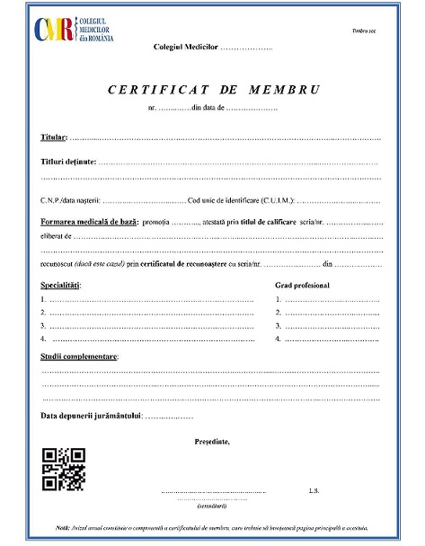 În temeiul art. 390, 392, 414, 416 şi 417 din Legea nr. 95/2006 privind reforma în domeniul sănătăţii, republicată, cu modificările şi completările ulterioare,văzând prevederile:– Ordonanţei Guvernului nr. 18/2009 privind organizarea şi finanţarea rezidenţiatului, aprobată prin Legea nr. 103/2012, cu modificările şi completările ulterioare;– Ordinului ministrului sănătăţii publice şi al ministrului educaţiei, cercetării şi tineretului nr. 1.141/1.386/2007 privind modul de efectuare a pregătirii prin rezidenţiat în specialităţile prevăzute de Nomenclatorul specialităţilor medicale, medico-dentare şi farmaceutice pentru reţeaua de asistenţă medicală, cu modificările şi completările ulterioare;– Ordinului ministrului sănătăţii nr. 527/2011 pentru aprobarea Normelor metodologice privind încadrarea şi activitatea medicului cu competenţe limitate,Consiliul naţional al Colegiului Medicilor din România emite prezenta decizie.Capitolul I Prevederi generaleArticolul 1(1) Certificatul de membru al Colegiului Medicilor din România reprezintă documentul emis de Colegiul Medicilor din România, prin colegiile teritoriale, în baza căruia titularul poate exercita profesia de medic pe teritoriul României, conform nivelului de pregătire în profesie şi prevederilor legale aplicabile. Certificatul de membru va fi compus din pagina principală şi din avizul anual privind exercitarea profesiei de medic, care vor conţine un cod QR.(2) Codul QR este un link web unic pentru fiecare document, accesibil de pe un telefon sau calculator cu camera web.(3) Scanarea codului QR oferă posibilitatea validării documentului pe site-ul Colegiului Medicilor din România şi a afişării datelor prevăzute în Registrul medicilor public.Articolul 2(1) Certificatul de membru al Colegiului Medicilor din România se acordă, la cerere, persoanelor prevăzute la art. 376 alin. (1) din Legea nr. 95/2006 privind reforma în domeniul sănătăţii, republicată, cu modificările şi completările ulterioare, care îndeplinesc cumulativ următoarele condiţii:a) deţin un titlu oficial de calificare în medicină, în sensul art. 377 alin. (3) din Legea nr. 95/2006 republicată, cu modificările şi completările ulterioare;b) nu se găsesc în vreunul dintre cazurile de nedemnitate sau de incompatibilitate prevăzute de lege;c) sunt apte din punct de vedere medical pentru exercitarea profesiei de medic;d) nu au întrerupt exercitarea profesiei pe o perioadă mai mare de 5 ani sau au obţinut diploma de licenţă în ultimii 5 ani.(2) La primirea în rândul membrilor Colegiului Medicilor din România, medicul va depune jurământul profesional.Articolul 3Certificatele de membru al Colegiului Medicilor din România vor fi emise şi eliberate de colegiul teritorial al Colegiului Medicilor din România în a cărui rază îşi au, după caz, domiciliul/reşedinţa sau locul de muncă/unitatea la care urmează să îşi desfăşoare activitatea medicii solicitanţi, conform modelelor prevăzute în anexele la prezenta decizie.Capitolul II Eliberarea certificatului de membru la înscrierea în Colegiul Medicilor din RomâniaArticolul 4(1) Pentru medicii care deţin un titlu profesional potrivit art. 386 alin. (1) şi (2) din Legea nr. 95/2006, republicată, cu modificările şi completările ulterioare, se eliberează certificatul de membru compus din anexele nr. 1 şi 1.1 la prezenta decizie.(2) Certificatul de membru al Colegiului Medicilor din România prevăzut la alin. (1) se eliberează în baza următoarelor documente:a) formular de înscriere completat şi semnat;b) documentul de identitate, în original, după care va fi efectuată o fotocopie de persoana desemnată în acest sens de conducerea colegiului teritorial, care va fi certificată de titular, sau în format electronic transmis pe e-mail de la adresa de email declarată de medic ca adresă de corespondenţă electronică în relaţia cu Colegiul Medicilor din România sau prin programe informatice puse la dispoziţie de Colegiul Medicilor din România sau colegiul teritorial. Cartea electronică de identitate va fi însoţită de certificatul de atestare a domiciliului (obţinut din aplicaţia disponibilă https://hub.mai.gov.ro/), în termen de valabilitate, până la posibilitatea verificării cu cititoare sau în platforma digitală naţională;c) diploma de absolvire, în copie legalizată sau în format electronic transmis pe e-mail cu semnătură calificată sau avansată, definită potrivit prevederilor art. 3 pct. 11 şi 12 din Regulamentul (UE) nr. 910/2014 al Parlamentului European şi al Consiliului din 23 iulie 2014 privind identificarea electronică şi serviciile de încredere pentru tranzacţiile electronice pe piaţa internă şi de abrogare a Directivei 1999/93/CE, sau prin programe informatice puse la dispoziţie de Colegiul Medicilor din România sau colegiul teritorial;d) titlul/titlurile oficial(e) de calificare în profesia de medic sau, după caz, documentul care atestă recunoaşterea acestuia (acestora), în original, după care va fi efectuată o fotocopie de persoana desemnată în acest sens de conducerea colegiului teritorial, care va fi certificată de titular, sau în format electronic transmis pe e-mail cu semnătură calificată sau avansată, definită potrivit prevederilor art. 3 pct. 11 şi 12 din Regulamentul (UE) nr. 910/2014, sau prin programe informatice puse la dispoziţie de Colegiul Medicilor din România sau colegiul teritorial;e) dovada exercitării profesiei de medic în ultimii 5 ani, respectiv adeverinţă de la locul de muncă, dacă este cazul, sau dovada atestării competenţei profesionale, în original sau în format electronic transmis pe e-mail de la adresa de e-mail declarată de medic ca adresă de corespondenţă electronică în relaţia cu Colegiul Medicilor din România sau prin programe informatice puse la dispoziţie de Colegiul Medicilor