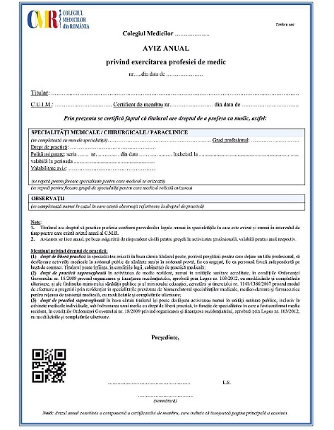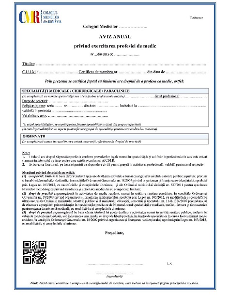 Anexa nr. 5FORMULAR de înscriere în Colegiul Medicilor ...........Subsemnatul(a),(nume) ............., (iniţiala tatălui) .., (prenume) .......... solicit înscrierea în Colegiul Medicilor ........ și eliberarea Certificatului de membru al Colegiului Medicilor din România, în conformitate cu datele personale completate mai jos si cu actele doveditoare anexate cererii.Date personale:CNP: [ ][ ][ ][ ][ ][ ][ ][ ][ ][ ][ ][ ][ ] sau data naşterii [ ][ ].[ ][ ].[ ][ ][ ][ ], act de identitate ......... seria ......... nr. ......, data expirării [ ][ ].[ ][ ].[ ][ ][ ][ ], permis de şedere (dacă este cazul) seria ... nr. ......., nume anterior (dacă este cazul) ........., statul de origine ......., cetăţenia 1 ........., cetăţenia 2 ......Titlul oficial de calificare în medicină:Diplomă/Adeverinţă (serie/număr/data eliberării) [ ][ ][ ]/[ ][ ][ ][ ][ ][ ]/[ ][ ].[ ][ ].[ ][ ][ ][ ], eliberată de ...... promoţia .... recunoscută (dacă este cazul) prin certificatul de recunoaştere având seria/nr. [ ][ ]/[ ][ ][ ][ ][ ][ ][ ][ ]/[ ][ ].[ ][ ].[ ][ ][ ][ ],Cod parafă [ ][ ][ ][ ][ ][ ][ ][ ]Pregătirea profesională:• Prima specialitate ...... grad [ ] rezident [ ] specialist [ ] primarconfirmată prin O.M.S. nr. [ ][ ][ ] din data de [ ][ ].[ ][ ].[ ][ ][ ][ ]• A doua specialitate ..... grad [ ] rezident [ ] specialist [ ] primarconfirmată prin O.M.S. nr. [ ][ ][ ] din data de [ ][ ].[ ][ ].[ ][ ][ ][ ]• A treia specialitate .... grad [ ] rezident [ ] specialist [ ] primarconfirmată prin O.M.S. nr. [ ][ ][ ] din data de [ ][ ].[ ][ ].[ ][ ][ ][ ]• A patra specialitate ..... grad [ ] rezident [ ] specialist [ ] primarconfirmată prin O.M.S. nr. [ ][ ][ ] din data de [ ][ ].[ ][ ].[ ][ ][ ][ ]Atestate de studii complementare: (dacă este cazul) ............ Titluri deţinute în domeniul medicinei umane:[ ] grad universitar ........ la Universitatea ................;[ ] doctor în medicină;[ ] master în ...............................;[ ] cercetător ştiinţific gradul ............;[ ] formator în .......................Loc/Locuri de muncă (Se vor menţiona toate locurile de muncă unde solicitantul desfăşoară în prezent activitate medicală, atât pe teritoriul României, cât şi pe teritoriul altor state.)*1. unitatea medicală ................ adresa ............. tel. [ ][ ][ ][ ][ ][ ][ ][ ][ ][ ]2. unitatea medicală ................ adresa ............. tel. [ ][ ][ ][ ][ ][ ][ ][ ][ ][ ]3. unitatea medicală ................ adresa ............. tel. [ ][ ][ ][ ][ ][ ][ ][ ][ ][ ]Adresă de domiciliuStr. ............ nr. ..... bl ..... sc ...., et. ..... ap. ......, cod poştal ....... localitatea ...., satul (dacă este cazul) sectorul (judeţul) ........, tel. fix [ ][ ][ ][ ][ ][ ][ ][ ][ ][ ][ ], mobil [ ][ ][ ][ ][ ][ ][ ][ ][ ][ ][ ], e-mail .......Adresa de corespondenţă (dacă este diferită de cea de domiciliu)Str. ...... nr. ...., bl. ......, sc. ......, et. ....., ap. ..., cod poştal [ ][ ][ ][ ][ ][ ][ ][ ][ ][ ], localitatea ...., satul (dacă este cazul) .......... sectorul (judeţul) ....... Declar pe propria răspundere că nu mă aflu în niciuna dintre situaţiile prevăzute de art. 388 şi 389 din Legea nr. 95/2006 privind reforma în domeniul sănătăţii, republicată, cu modificările şi completările ulterioare, sunt de acord cu prelucrarea datelor personale, inclusiv a CNP-ului, şi mă oblig să aduc la cunoştinţa Colegiului Medicilor ...... orice modificare a acestor date.Data............Semnătura..............(numele şi prenumele)Loc/Locuri de muncă (continuare)*4. unitatea medicală ............ adresa ............ tel. [ ][ ][ ][ ][ ][ ][ ][ ][ ][ ]5. unitatea medicală ............ adresa ............ tel. [ ][ ][ ][ ][ ][ ][ ][ ][ ][ ]6. unitatea medicală ............ adresa ............ tel. [ ][ ][ ][ ][ ][ ][ ][ ][ ][ ]7. unitatea medicală ............ adresa ............ tel. [ ][ ][ ][ ][ ][ ][ ][ ][ ][ ]8. unitatea medicală ............ adresa ............ tel. [ ][ ][ ][ ][ ][ ][ ][ ][ ][ ]9. unitatea medicală ............ adresa ............ tel. [ ][ ][ ][ ][ ][ ][ ][ ][ ][ ]10. unitatea medicală ............ adresa ............ tel. [ ][ ][ ][ ][ ][ ][ ][ ][ ][ ]Documentul se va tipări față-verso.Anexa nr. 6CEREREde avizare anuală a certificatului de membruSubsemnatul(a), (nume) ..............., (iniţiala tatălui) .........., (prenume) ........., cod numeric personal [ ][ ][ ][ ][ ][ ][ ][ ][ ][ ][ ][ ][ ], act identitate ....... serie ....... nr. ......, nume anterior ......, domiciliat(ă) în oraşul ............, str. ...... nr. ......, bl. ......, sc ......., et. ...., ap. ......., sectorul (judeţul) ......, cod poştal [ ][ ][ ][ ][ ][ ][ ][ ][ ][ ], tel. fix [ ][ ][ ][ ][ ][ ][ ][ ][ ][ ], mobil [ ][ ][ ][ ][ ][ ][ ][ ][ ][ ], e-mail ........., posesor(posesoare) al(a) Certificatului de membru al Colegiului Medicilor din România nr. ...... din data ......, având codul unic de identificare a medicului nr. [ ][ ][ ][ ][ ][ ][ ][ ][ ][ ][ ][ ][ ][ ][ ][ ][ ][ ], vă rog să îmi aprobaţi avizarea anuală a Certificatului de membru al Colegiului Medicilor din România pentru următoarele specialităţi şi/sau calificări profesionale:1. .......... 2. ..........3. .......... 4. .......... Anexez prezentei cereri:1. copia poliţei de asigurare civilă pentru greşeli în activitatea profesională care acoperă specialităţile sau calificările pentru care doresc acordarea vizei, cu valabilitate în perioada ............................, certificată conform cu originalul;2. documente doveditoare atât pentru completarea punctajului EMC, cât şi pentru modificările care au survenit de la comunicarea anterioară, pe care le declar conforme cu originalul;3. copia adeverinţei privind locul de muncă (în cazul în care ultima depusă la colegiul teritorial este mai veche de 5 ani).Declar pe propria răspundere că:[ ] Nu au intervenit modificări în datele furnizate de su
