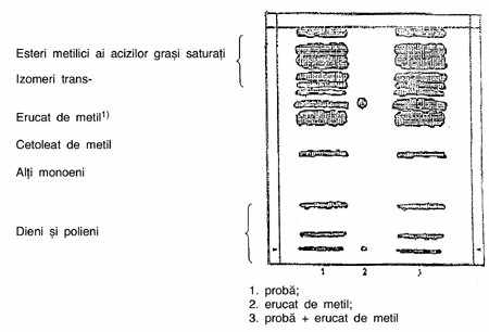 Articolul 1Prezentele norme se aplică pentru:a) uleiuri, grăsimi şi amestecuri din acestea, destinate ca atare consumului uman;b) produse alimentare compuse, în care uleiurile, grasimile sau amestecurile din acestea au fost adăugate, iar conţinutul lor total de grasime depăşeşte 5%.Articolul 2Nivelul maxim de acid erucic în produsele menţionate la art. 1, calculat pentru nivelul total de acizi grasi din componenta de grasime, nu poate depăşi 5%.Articolul 3Metoda de analiza pentru determinarea nivelului maxim de acid erucic în produsele menţionate la art. 1 este prevăzută în anexa care face parte integrantă din prezentele norme.Anexa -------la norme--------DETERMINAREAconţinutului de acid erucic în uleiuri şi grăsimi destinateca atare consumului uman, precum şi în componenta uleioasasau grasa a produselor alimentare cu adaos de uleiuri sau grăsimiI. INTRODUCERE1. Prepararea probei pentru analiza1.1. GeneralitatiMasa probei de laborator destinate analizei de laborator trebuie să fie în mod normal de 50 g, exceptându-se cazul în care este necesară o cantitate mai mare.1.2. Pregătirea probei pentru analiza de laboratorProba trebuie omogenizata înainte de analiza.1.3. ConservareProba preparata trebuie menţinută în permanenta într-un recipient ermetic.2. Reactivi2.1. Apa2.1.1. Când se menţionează apa pentru soluţii, diluari sau spalari, se face referire la apa distilata sau demineralizata de puritate cel puţin echivalenta.2.1.2. Când se menţionează o soluţie sau o diluare, fără alta indicaţie asupra reactivului, se face referire la o soluţie apoasa.2.2. Reactivi chimiciToţi reactivii chimici trebuie să fie de calitate analitica recunoscută, cu excepţia unor specificaţii contrare.3. Aparatura3.1. Lista cuprinzând aparaturaLista cuprinzând aparatura conţine numai piese destinate utilizării specializate şi care prezintă specificaţii speciale.3.2. Balanţa analiticaPrin balanţa analitica se înţelege o balanţa care are o precizie de cel puţin 0,1 mg.4. Prezentarea rezultatelor4.1. RezultateRezultatul scris pe buletinul de analiza oficială reprezintă valoarea medie obţinută din cel puţin două determinări a căror repetabilitate este satisfăcătoare.4.2. Calculul procentuluiCu excepţia unor prevederi speciale, rezultatele sunt exprimate în procente de masa din acizii grasi totali din proba primită de laborator.4.3. Număr de cifre semnificative Rezultatul comporta un număr de cifre semnificative în funcţie de precizia metodei.II. DETERMINAREA ACIDULUI ERUCIC1. Obiectivul şi domeniul de aplicareMetoda permite determinarea conţinutului de acid erucic din următoarele:a) uleiurile şi grasimile care conţin acid cetoleic (un izomer cis- al acidului docosenoic care se găseşte în uleiurile de peste); şib) uleiurile şi grasimile hidrogenate care conţin izomeri trans- şi cis- ai acidului docosenoic.2. PrincipiuEsterii metilici ai acizilor grasi componenţi ai uleiului şi grasimii sunt separati prin cromatografie în strat subtire prin argintare la temperatura scăzută şi se determina cantitativ prin cromatografie gaz-lichid.3. Reactivi3.1. Eter dietilic uscat, fără peroxid, proaspăt distilat3.2. n-Hexan3.3. Silicagel G pentru cromatografie în strat subtire3.4. Silicagel pentru cromatografie în coloana3.5. Soluţie de nitrat de argint, 200 g/l. Se dizolva 24 g nitrat de argint în apa şi se completează cu apa până la 120 ml.3.6. Soluţie de erucat de metil, 5 mg/ml. Se dizolva 50 mg erucat de metil în cativa mililitri de n-Hexan şi se diluează cu n-Hexan până la 10 ml.3.7. Soluţie etalon interna de tetracosanoat de metil, 0,25 mg/ml. Se dizolva 25 mg tetracosanoat de metil în cativa mililitri de n-Hexan (vezi pct. 3.6) şi se dilueaza cu n-Hexan până la 100 ml.3.8. Solvent de developare. Toluen şi n-Hexan în raport de 90:10 (v/v).3.9. Soluţie de 2,7 diclorofluoresceina, 0,5 g/l. Se dizolva prin încălzire şi se agita 50 mg de 2,7 diclorofluoresceina în 100 ml soluţie apoasa conţinând 50% metanol.4. Aparatura4.1. Aparat pentru cromatografie în strat subtire, care cuprinde următoarele:4.1.1. o unitate de congelare, capabilă sa menţină recipientul de developare şi conţinutul sau la o temperatura de la minus 20°C la minus 25°C;4.1.2. plăci din sticlă, 200 x 200 mm;4.1.3. lampa cu raze ultraviolete;4.1.4. coloane din sticlă, cu lungimea de aproximativ 200 mm, diametrul intern de aproximativ 10 mm. prevăzute cu filtre din vata de sticlă ori sticlă sinterizata, sau palnii mici prevăzute cu filtre din sticlă sinterizata;4.1.5. un aplicator pentru depozitarea soluţiilor, în forma de banda ingusta sau dunga pe plăci de TLC4.2. cromatograf gaz lichid cuplat cu un integrator electronic5. Mod de operare5.1. Pregătirea esterilor metilici ai acizilor grasiSe ia o proba de aproximativ 400 mg componenta de ulei sau grasime a probei pentru analiza şi se prepara o soluţie care conţine aproximativ 20-50 mg/ml esteri metilici ai acizilor grasi din n-Hexan.5.2. Cromatografie în strat subtire5.2.1. Pregătirea placilorSe introduc 60 g silicagel (pct. 3.3) într-un balon cu fund rotund de 500 ml, se adauga 120 ml soluţie de nitrat de argint (pct. 3.5) şi se agita un minut până la obţinerea unei paste foarte omogene. Se întinde pasta în mod obişnuit pe plăci; grosimea stratului trebuie să fie de aproximativ 0,5 mm. Aceasta cantitate de pasta este suficienta pentru prepararea a cinci plăci de 200 x 200 mm.Se usucă parţial plăcile cu aer, de preferinta în intuneric, aproximativ 30 de minute. Se usucă şi se activează plăcile prin uscare în cuptor, mentinandu-l la 100°C timp de 2 ore şi 30 de minute. Plăcile trebuie utilizate cat mai repede posibil după faza de activare sau se păstrează cu atenţie într-un spaţiu intunecat şi se reactiveaza înainte de utilizare. (Notă: Activarea la 110°C timp de o ora poate fi satisfăcătoare cu condiţia ca plăcile sa nu se in